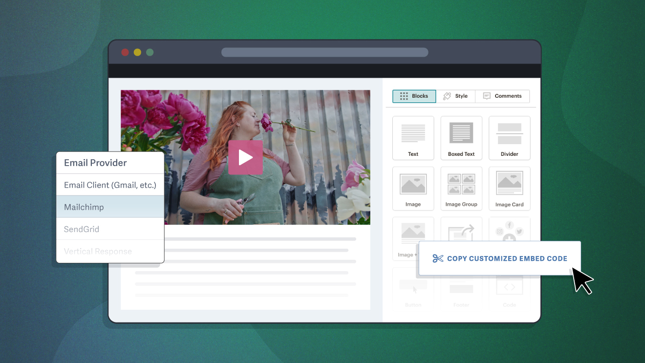 Simplify the process with a custom email embed code. Skip creating a GIF or adding a play button overlay with external software. Instead, you can easily generate your static or animated poster frame, add a brand-colored play button (or hide it), and add your destination URL. Insert the generated embed code into the email and you’re done!