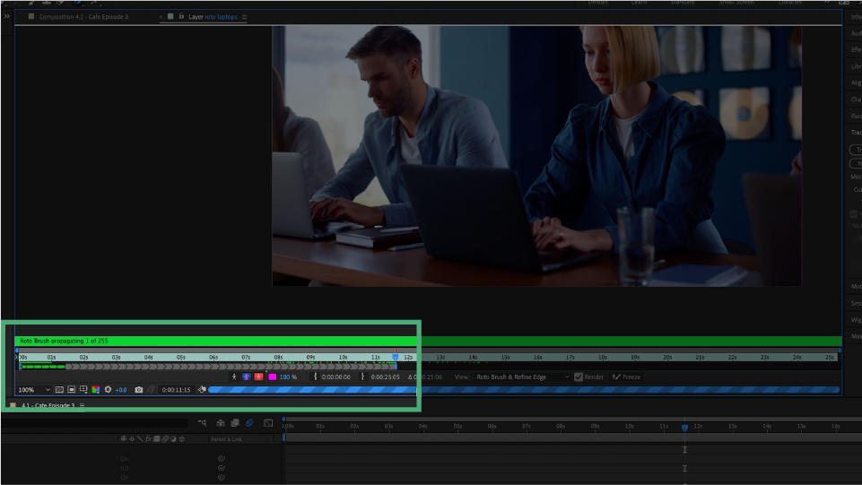 The Rotobrush tool is a much faster way to rotoscope since it uses After Effects software to speed up the process. Essentially, it allows you to paint over the object you want to select and then After Effects’ artificial intelligence will automatically detect the edge of whatever object you’re trying to isolate. It will then propagate that selection across the timeline automatically, instead of having to do it manually with masking.