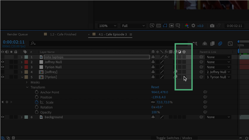 You may not see any differences right away once the camera is created, and for good reason. Only layers with the 3D option enabled will be affected by the camera. For this project, we’ll turn on just the Tyrion and Joffrey nametag layers.