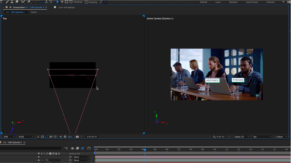Once this is complete, you can turn on the roto layer and you’ll be able to see your finished product in full. The adjusted nametag should slide behind laptops, blur with the footage, and be positioned at the right angle with the scene.