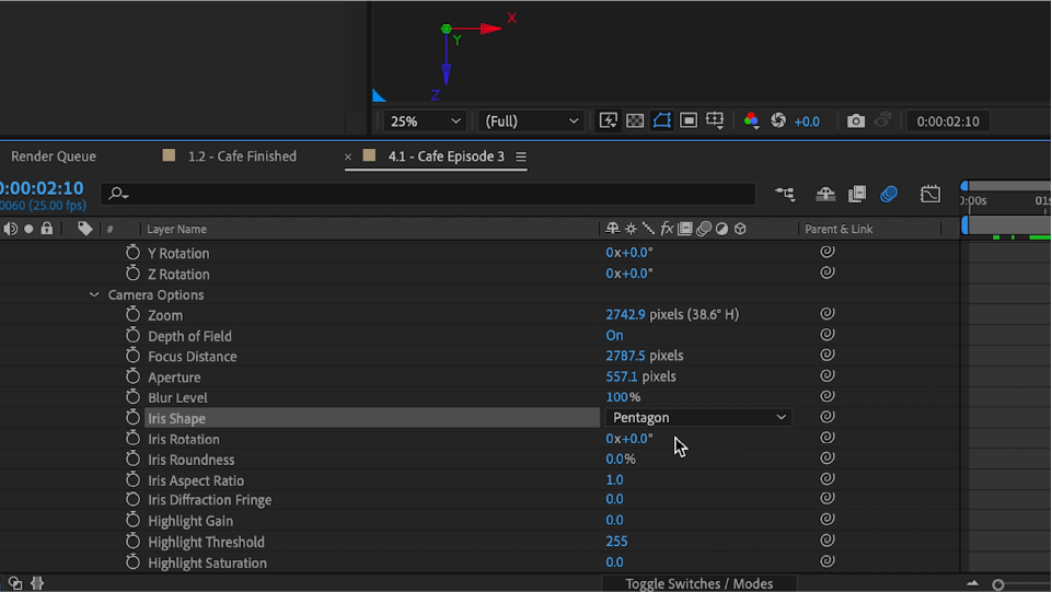 To further match the look of the footage to your objects, open the Camera Options drop-down under the transform parameters in the Layers tab. This lets you dive into all the settings of an actual camera, which you can adjust to make the nametags really blend into the scene.
