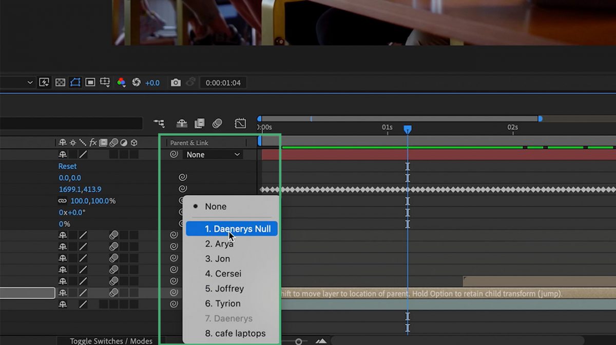 To apply this, go to the layer you want to be the ‘Child’, for our example that is the Daenerys layer, and under the Parent & Link section of the layers tab, select the Null object to make it the parent.