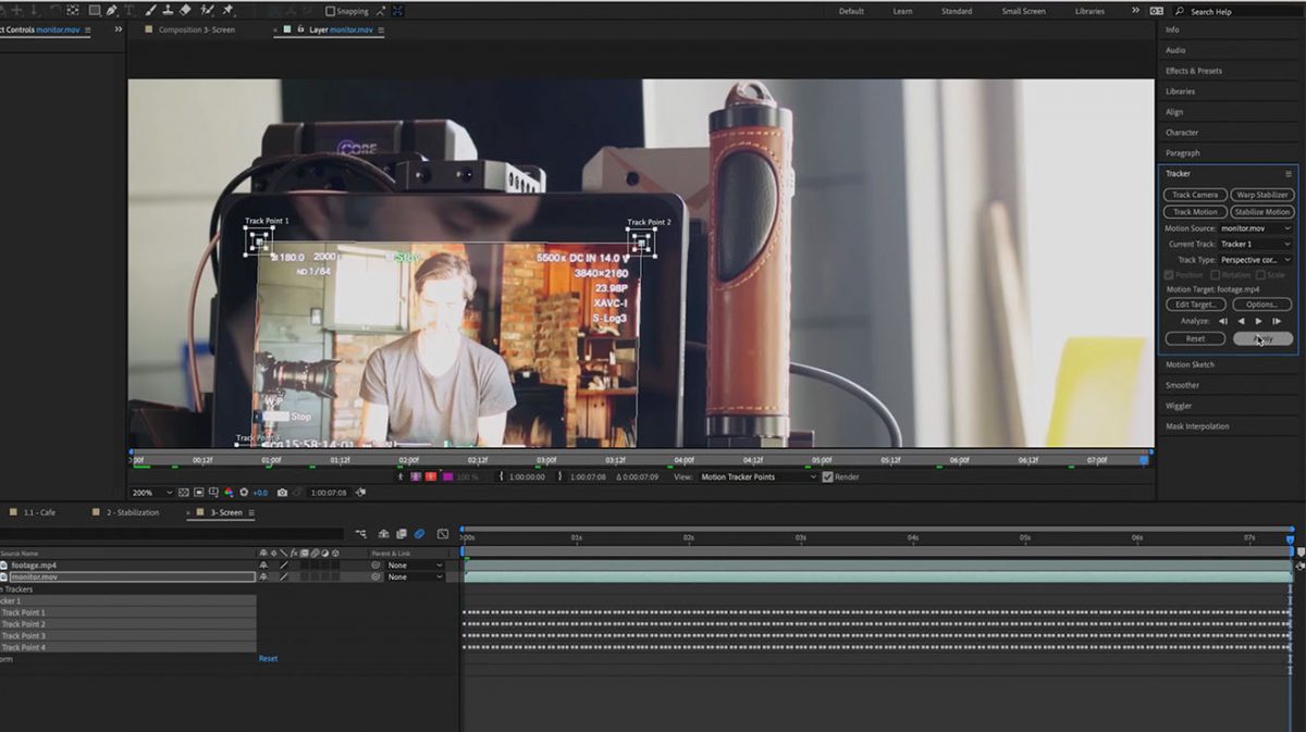 After Effects can compensate for any shakes, rotation, or changes in the footage, so this technique will work for just about any clips where you need to replace a screen.