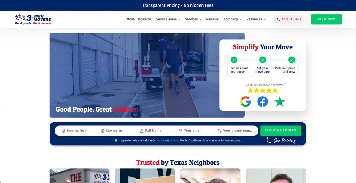 On video landing pages, businesses often use customer testimonial videos as supporting elements alongside text, videos, and rich media. For example, the 3 Men Movers homepage includes social proof, a “Free Move Estimate” CTA, customer testimonials, and a service demonstration video (which autoplays, loops, and hides all player controls). Significantly, all elements are visible when viewers land on the page.