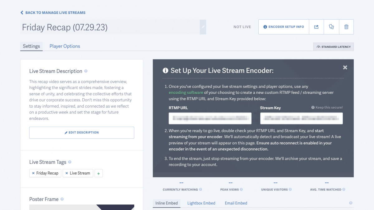 Since you need encoding software to live stream, you can set all of this up before going live. You can create an identical live stream to test (as recommended above), then embed the live stream on your website days or weeks before going live. This allows you to set up and schedule email campaigns (with working links) ahead of time as well.